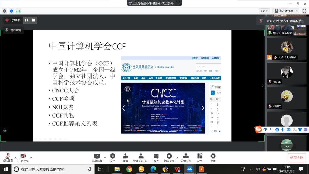 2022年4月29日下午,永利集团88304官网计算机与通信工程学院“云峰”论坛之前沿论坛2022年第2期线上会议成功举行。本次会议邀请CCF专委会秘书长、国防科技大学计算机学院蔡志平教授、沈立教授、董威教授和赵宝康副教授分别做了“IPv6环境下的网络安全和智能测绘技术”、“全状态量子模拟器在CUP+GPU异构平台上的性能优化”、“程序生成——从自动化到智能化”和“6G时代的天地一体化网络技术”4场精彩的学术报告。同时4位老师也分别介绍了CCF理论计算机学科专委会、CCF体系结构专委会、CCF形式化方法专委会和CCF互联网专委会。报告会由永利集团88304官网计算机与通信工程学院张锦院长和何施茗副院长共同主持。我院师生160余人积极参加了此次报告会。
