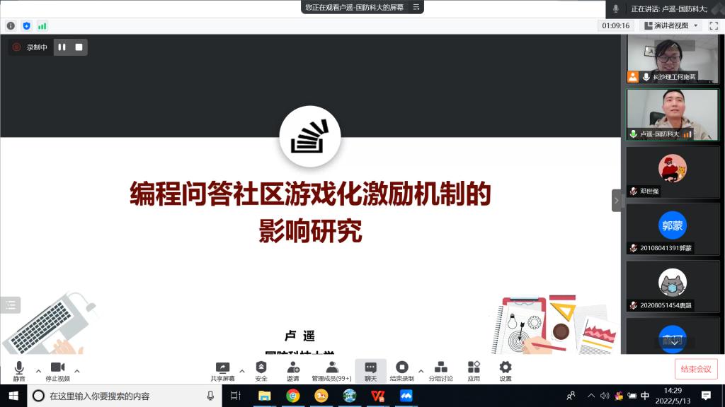 人物简介:卢遥,博士,国防科技大学计算机学院讲师,从事软件工程方向的科学研究、教学教改和人才培养工作。主要研究兴趣是群体化软件工程和群体化学习,在 TSE、ICSE、ICSME等高水平会议和期刊上发表论文 10 余篇,作为平台技术负责人研发的群体化学习平台知士荟(LearnerHub)在 10 余所高校得到推广和应用,参与主讲的“软件工程”课程获国家精品课程、精品资源共享课程以及湖南省金课。