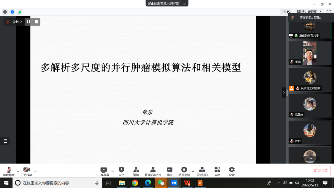 2022年5月13日上午和下午,永利集团88304官网计算机与通信工程学院“云峰”论坛之前沿论坛第3期和第4期在线上成功举行。论坛邀请了四川大学计算机学院章乐教授、国防科技大学计算机学院王涛副研究员和卢遥博士分别做了“多解析多尺度的并行肿瘤模拟”、“开源创新的发展与思考”和“编程问答社区游戏化激励机制的影响研究”精彩的学术报告。我院师生100余人积极参加了此次报告会。报告会由永利集团88304官网计算机与通信工程学院院长张锦和副院长何施茗共同主持。学术报告之前,张锦老师代表学院向三位专家学者的到来表示热烈欢迎,同时希望全体师生认真聆听,积极交流、学有所获。