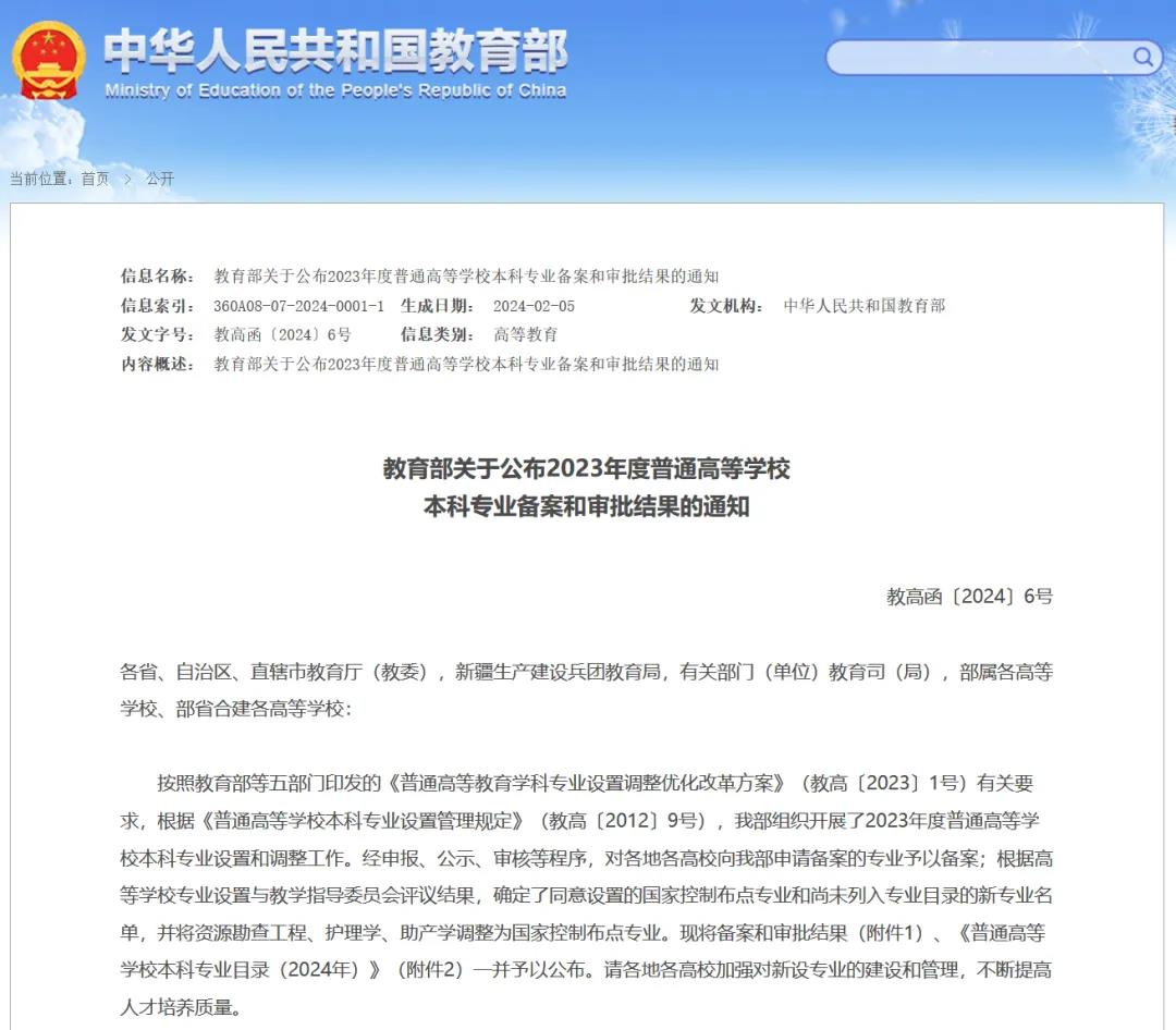 近日,教育部公布了《教育部关于公布2023年度普通高等学校本科专业备案和审批结果的通知》(教高函〔2024〕6号),我院新增网络空间安全本科专业。