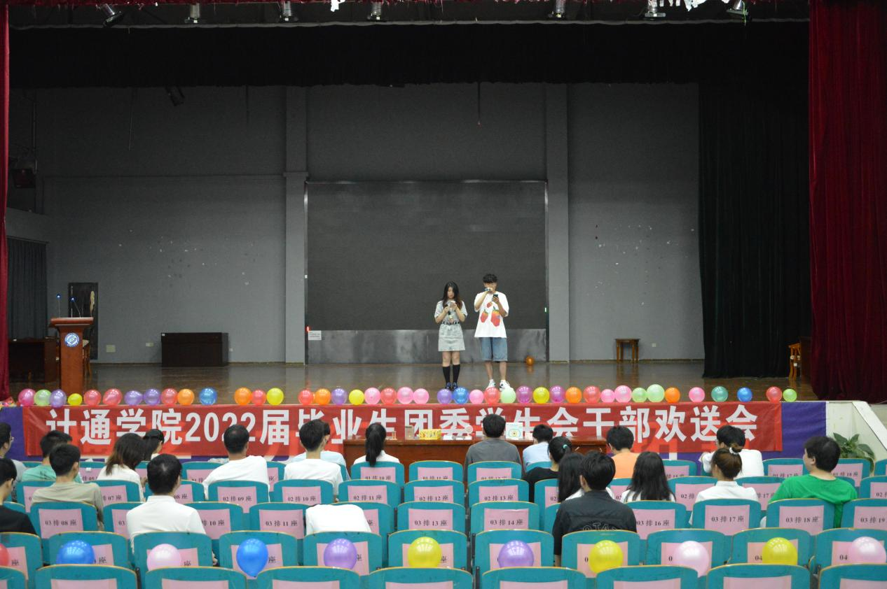 为欢送第十六、十七届学生会成员,给予美好祝愿,6月21日晚,计通学院团委学生会在云塘校区学生活动报告厅举办2022届毕业生团委学生会干部欢送会。计通学院团委书记潘枝花、团委副书记齐铁钧出席,第十六、十七届团委学生会部分成员参加,文体部实践团成员董步、卢依婷主持。