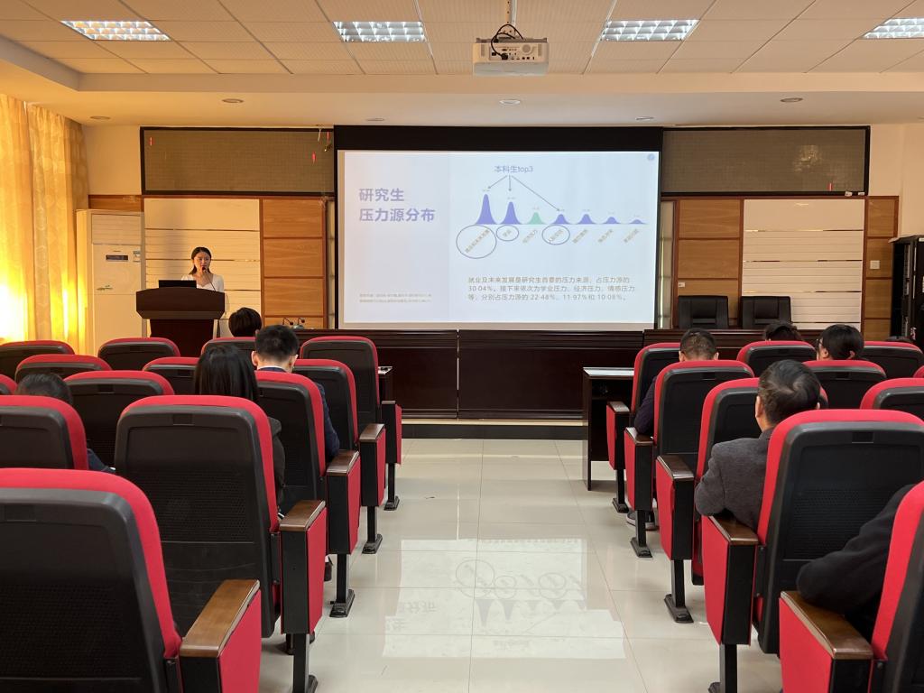 党委副书记王觊婧就当前我院心理健康教育工作情况作了介绍,强调当前高校心理健康教育的重要性。心理辅导员潘枝花根据调研数据结果、结合学院几个案例向全体老师说明了当前研究生、本科生的主要心理困扰因素和压力源,就如何处理学生出现的心理问题,以及如何更好地帮扶学生拜托情绪困扰,解决现实困难给出建议。她介绍了高校大学生常见心理问题的类型、原因以及典型症状,向老师们普及了心理咨询和心理治疗的基本知识,以及危机干预的基本程序,并就“双十”精神卫生日进行了宣讲。