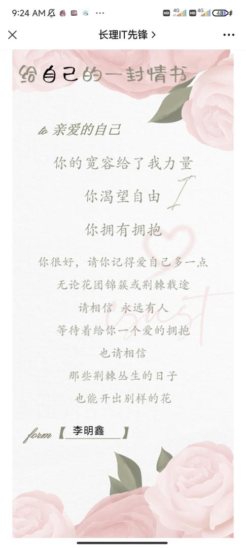 情书的内容丰富多样,有的表达了对自己坚定的爱与支持,有的表达了对未来美好生活的向往,更有的表达了对自己的鼓励和勇气这些情书不仅是对自己的深情告白,也成为了激励他人的力量。每一封情书都值得我们永远地铭记。