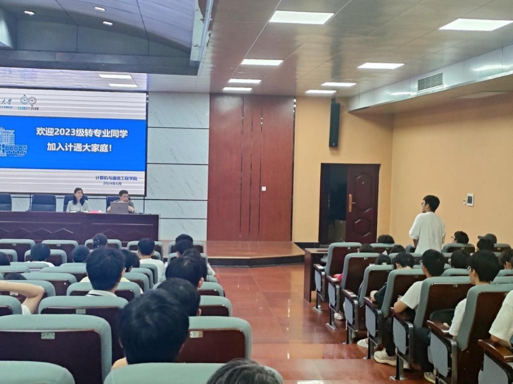 6月24日下午,计算机与通信工程学院2023级转专业学生大会在金盆岭校区4教报告厅顺利举行。2023级辅导员刘洋、刘俊出席此次会议,2023级转入计通学院的全体学生参加此次会议。此次活动旨在为新转入的学生提供一个互相认识、沟通交流的平台,帮助他们更好地融入新的学习环境。