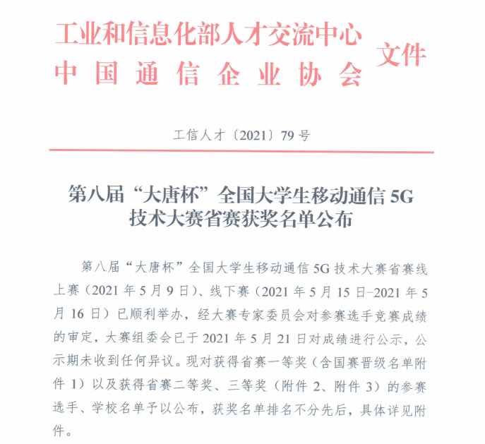 近日,“第八届‘大唐杯’全国大学生移动通信5G技术大赛”省赛获奖名单揭晓,计通学子在2021年5月9日上午进行的湖南省省赛中获得一等奖3项、二等奖5项、三等奖15项的优异成绩。