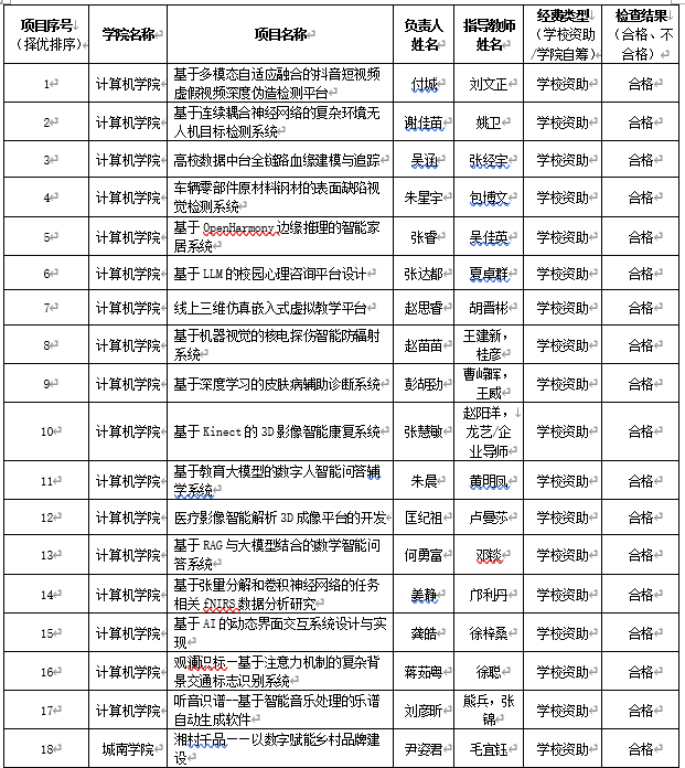 根据学校《关于开展2025年大学生创新创业训练计划项目中期检查暨省级项目推荐立项工作的通知》要求,计算机学院520日组织专家对2025年立项的大学生创新训练计划项目进行了中期检查评审。现将检查结果公示如下: