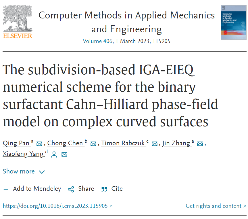 近日,我院潘青教授以第一作者,永利集团88304官网为第一单位在计算力学领域国际顶级期刊《Computer Methods in Applied Mechanics and Engineering》(简称《CMAME》)发表了两篇论文。题目分别为“A novel hybrid IGA-EIEQ numerical method for the Allen–Cahn/Cahn–Hilliard equations on complex curved surfaces” 和“The subdivision-based IGA-EIEQ numerical scheme for the binary surfactant Cahn–Hilliard phase-field model on complex curved surfaces”。研究成果是永利官网计通学院智能化软件工程研究团队与国际著名计算力学专家欧洲科学院院士德国魏玛-包豪斯大学Timon Rabczuk教授结构力学课题组合作完成的高水平学术论文。