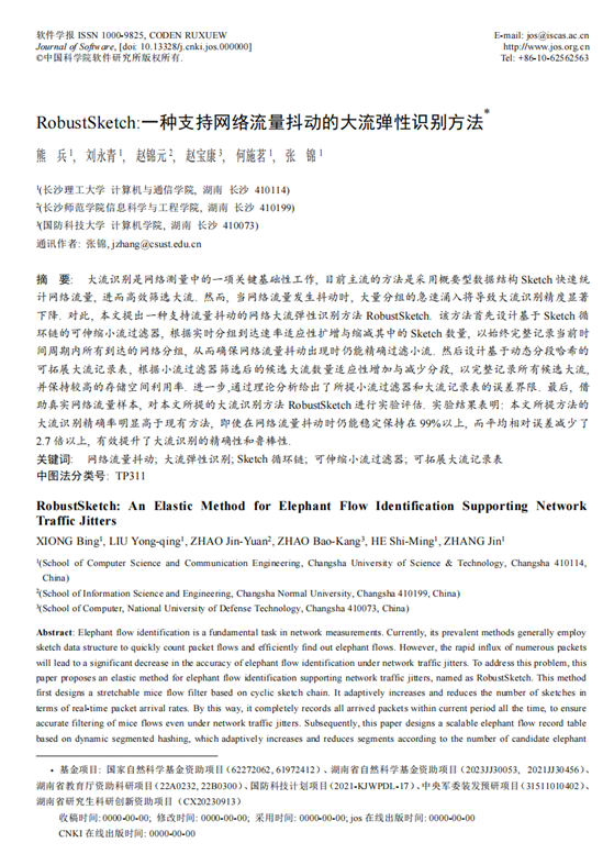 近日,以我院熊兵副教授为第一作者,永利集团88304官网为第一作者单位的学术论文“RobustSketch:一种支持网络流量抖动的大流弹性识别方法”被软件工程领域的权威期刊《软件学报》录用。《软件学报》致力于介绍计算机科学和计算机软件新理论、新方法和新技术以及学科发展趋势,主要涉及理论计算机科学、算法设计与分析、系统软件与软件工程、数据库技术、计算机网络及其他相关内容的研究。该期刊由中国科学院软件研究所和中国计算机学会联合主办,是CCF A类中文学术期刊。