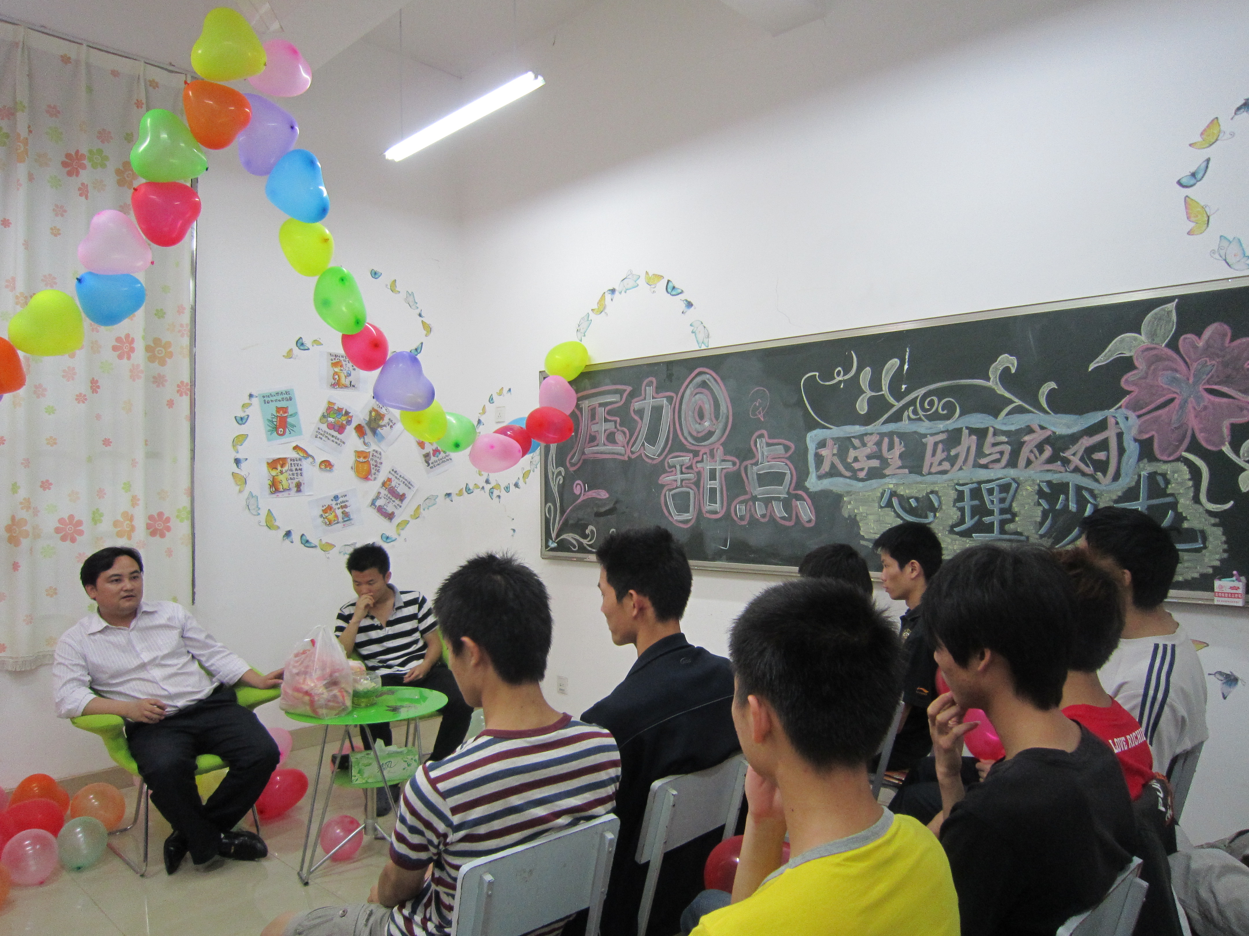为配合学校第八届525大学生心理健康宣传活动月,提高学生应对压力与挫折的能力,5月27日晚七点,计通学院在理科楼B-101学生心理成长辅导室开展了“压力@甜点”大学生压力与应对心理沙龙活动。此次沙龙活动由心理辅导员伍接朝老师主持,全院各年级三十余名经过筛选的同学参加,学院朋辈心理工作部部长唐月来同学作为嘉宾与同学们分享大学生活的压力经历。整个沙龙活动由压力分享、群策压力、压力释放等环节组成。