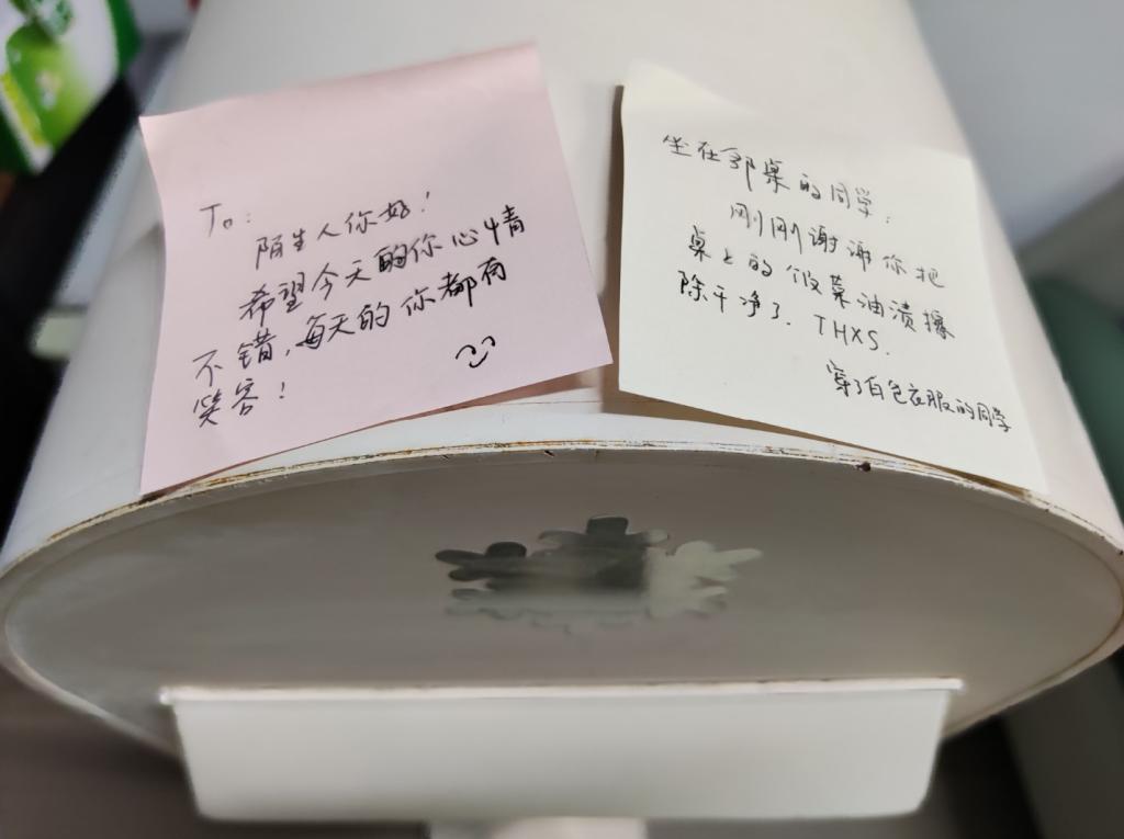 有同学表达了当天在食堂经历的一件小事:邻座的同学用餐前用纸把整张桌子都擦拭干净了,惠及同桌的其他同学;还有的同学表达了对排队时候帮忙给自己抬了一下餐盘的同学的感谢;有的同学表达了对陌生人的祝福......