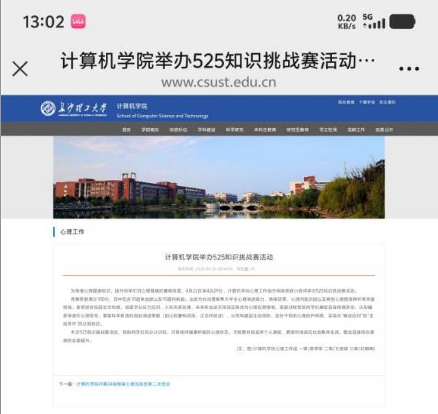 延续 “以赛促学” 理念,采用 “线上答题” 形式开展心理知识竞赛。竞赛内容涵盖大学生常见心理问题识别、情绪管理技巧、朋辈互助方法等知识点。组织开展了以“悦学养心,向阳成长”为主题的525知识竞赛活动,旨在鼓励同学们保持积极向上的心态、注重自我调节和心理疏导,从而更好地面对困难和压力,获得幸福和成长。竞赛有效普及了 “心理韧性”“情绪 ABC 理论” 等专业知识,赛后调查显示,80% 的学生掌握了至少 3 种压力调节方法,形成了 “学心理、懂心理” 的校园氛围。