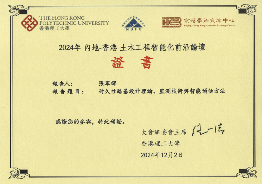 为进一步促进内地和香港高校科技交流合作,近日,永利官网张军辉副校长一行参加由国家自然科学基金委员会资助、香港理工大学举办的主题为“土木工程智能化”前沿论坛,并作了题为“耐久性路基设计理论、智慧监测技术与智能预估方法”的交流汇报,交通运输工程学院教师高峰、彭俊辉参加了本次论坛。