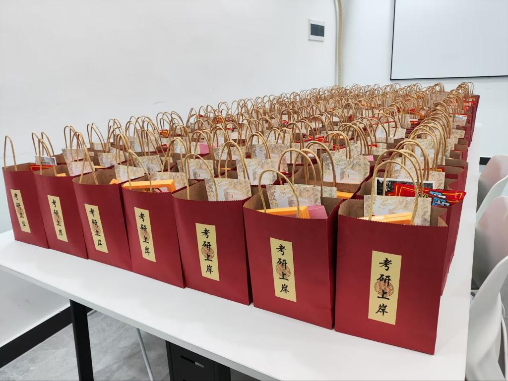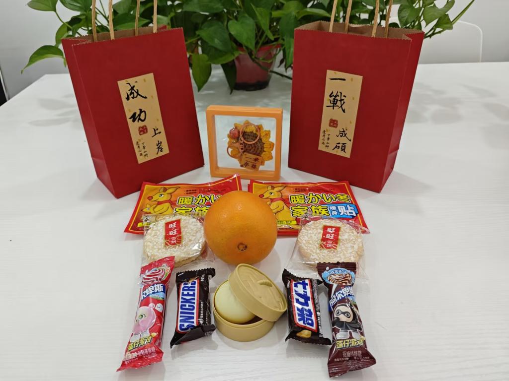 考研加油包内含有水果和小零食,分别代表着心想事“橙”、旗开“德”胜、神来气“旺”,金“棒”提名等寓意。学院为每位考研学子准备了幸运摆件、解压玩具、暖宝宝和祝福贺卡,帮助考研学子们坚定考研信心,缓解紧张情绪,成为同学们冬日考研倒计时里最温暖最特别的留恋。