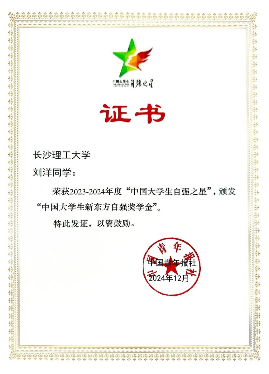 近日,由共青团中央、全国学联指导,团中央基层建设部、中国青年报社主办的2023-2024年度“中国大学生自强之星”奖学金推报活动结果揭晓,永利集团88304官网交通学院交通运输规划与管理专业2020级博士研究生刘洋获评“中国大学生自强之星”荣誉称号。