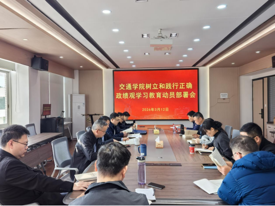 2026年3月12日上午,交通学院在工二B413会议室召开树立和践行正确政绩观学习教育动员部署会,对学院开展学习教育工作进行安排部署。学院党委书记成华主持会议。学院党政班子成员、教工党支部书记参加会议。