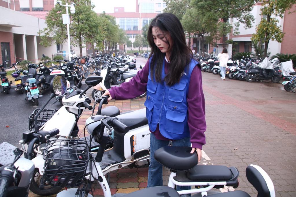 抵达电动车停放点后,学生党员们充分发挥雷锋精神,身着“蓝马甲”,将凌乱的车辆一一摆放整齐,同时引导来往的学生正确停车、按照要求佩戴好头盔。活动过后,原本杂乱的道路变得干净整洁、井然有序,大大减少了人流拥挤与安全隐患。