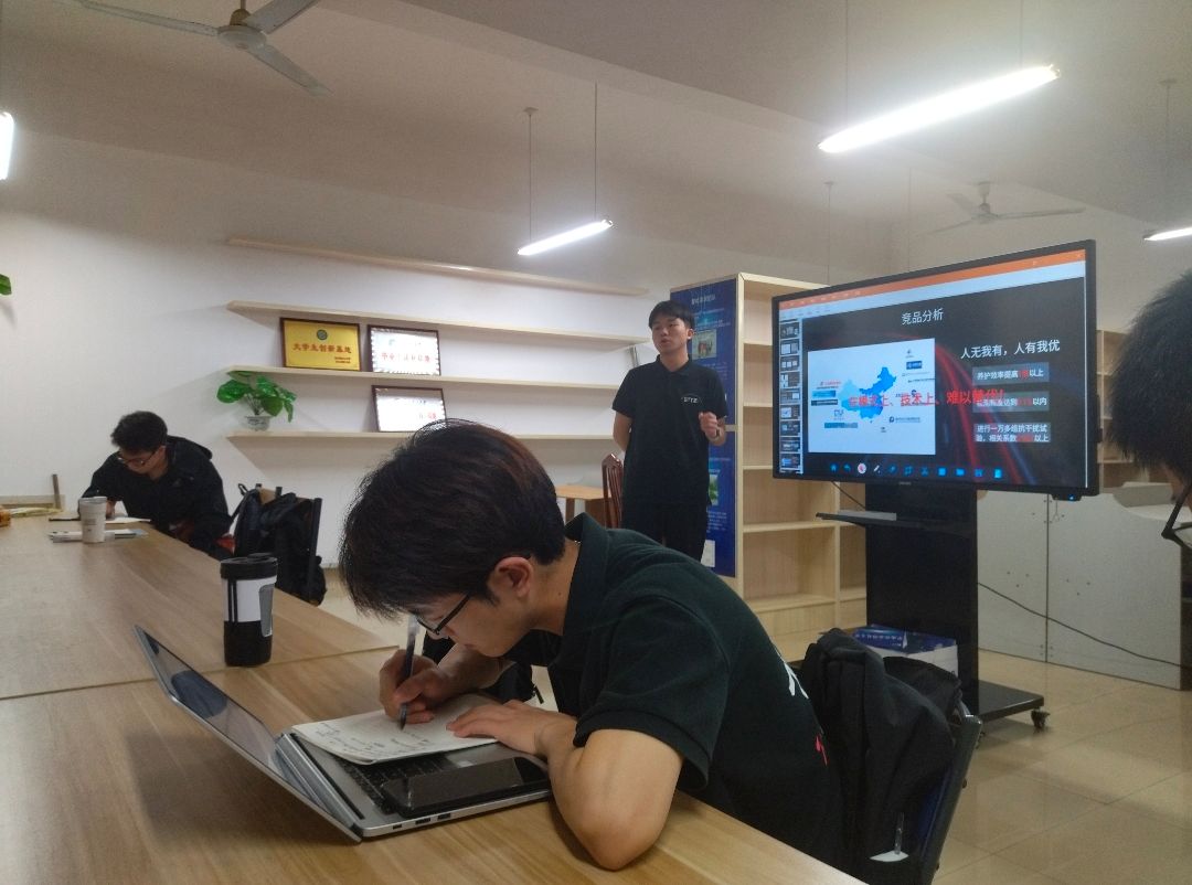 会议伊始,梁波介绍“创青春”赛事的特点,强调参加学科竞赛的项目一定要有相关的材料支撑,比如专利、论文、调查报告等,不能只局限于文案工作,要真正地不断打磨,把项目落地,做出成果。接着,“路检安”项目团队负责人潘博洋、“沥沥安”项目团队负责人黎冲上台展示项目。随后,梁波与涂道勇向两位项目负责人分析了项目存在的问题,并针对性地提出了改进方法。最后,涂道勇表示各个小组参加竞赛的汇报PPT和项目申报书都要列出与同类型项目或产品相比的优势,强调项目能够解决当前的哪些痛点,指出项目开展的必要性。