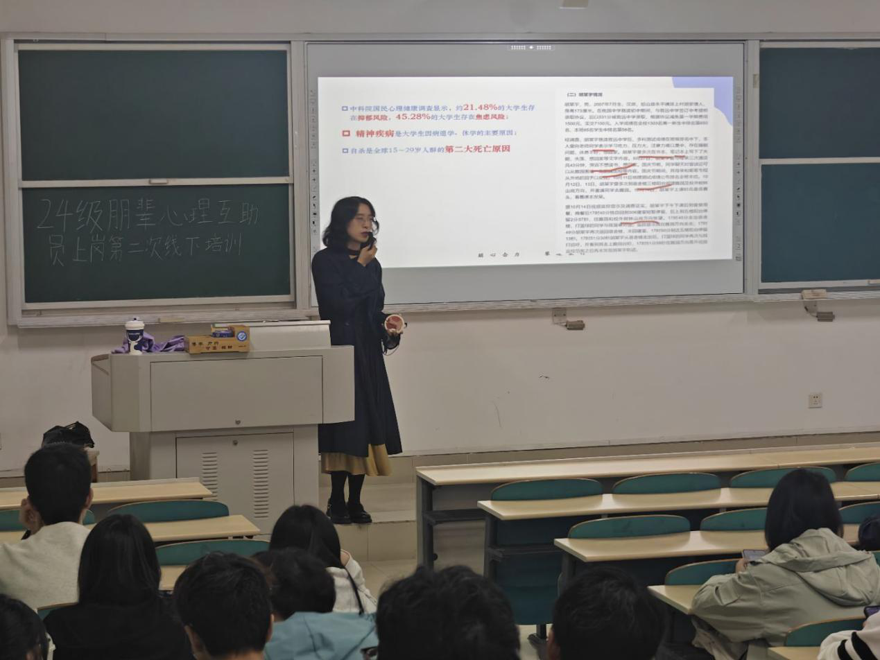 本次培训由学工部心理中心曾玮怡,卢灵舢和学院心理辅导员汪招霞老师授课,内容兼具实用性与针对性。此次培训重点明确“倾听共情”的正确方式与常见误区,切实提升心理互助员们的共情能力与互助实效;阐述了朋辈互助员要识别常见心理障碍、详解危机干预流程,夯实应急处置基础;聚焦倾听共情技巧与误区、心理障碍识别及危机干预流程,以互动演练强化实操,筑牢校园心理健康防线。本次培训朋辈心理互助员主要内容包括基本知识、助人技巧、危机的识别与处理等内容,提升朋辈互助员的心理助人能力,充分发挥朋辈互助在心理健康教育中的重要作用。