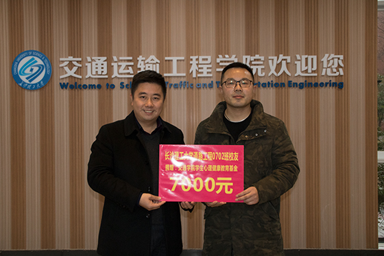 1月8日下午,交通学院原道路工程专业07级仲文亮校友回到母校,将全班同学募集的7000元交到学校校友基金会,专门用于支持交通学院学生心理健康教育工作。