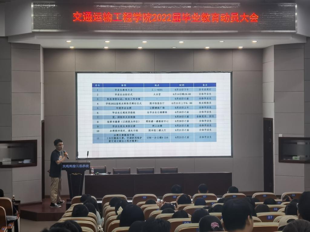 6月13日下午,交通运输工程学院2022届毕业教育动员大会在云塘校区工科二号楼交通科技报告厅召开,会议由交通学院2018级辅导员曹骁主持,2022届全体毕业生参会。