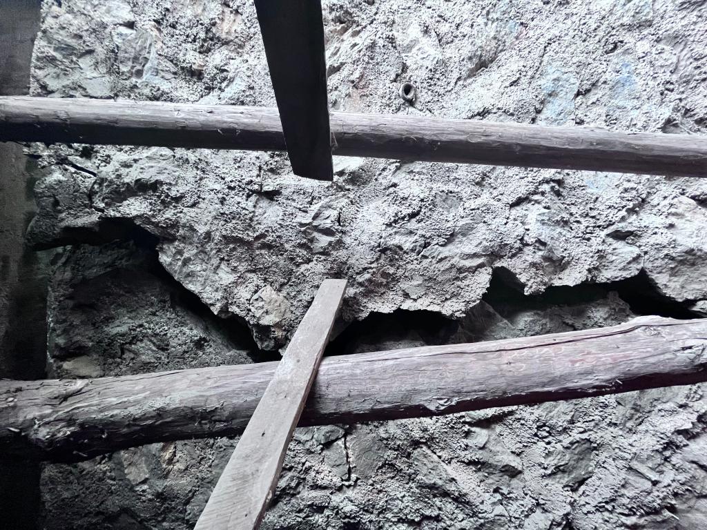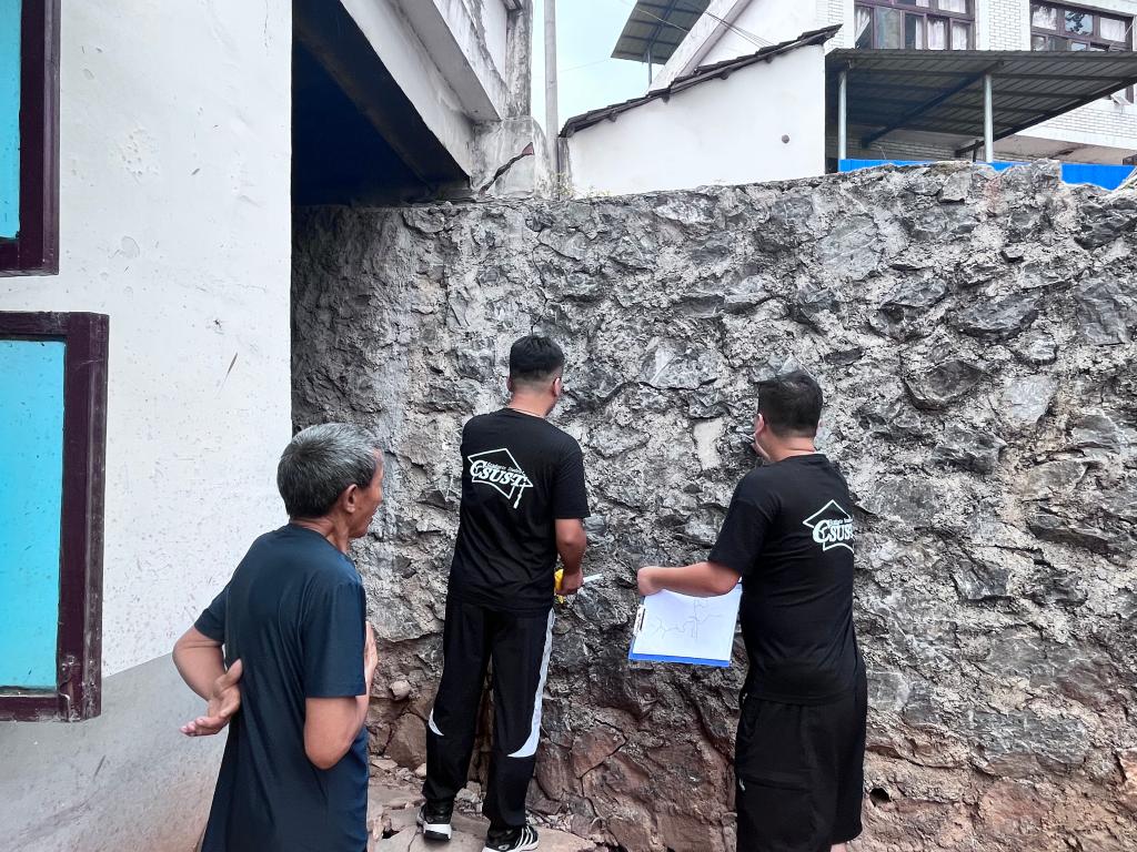 实践团还深入走访当地村民家中,发现部分道路边坡非常陡峭,仅仅用水泥进行支护,而且存在严重的开裂现象,村民不得不用棍子或者木头支撑起来。实践团成员当即意识到边坡破坏的严重性,针对以上现象进行集中讨论,并提出对策:临时限制重型车辆的通行,采取抗滑桩加固或者锚杆支护等措施对边坡进行修复,待修复工作完成后再恢复通行。联系当地有关部门协作配合,严把工程质量,力求早日为横桥村解决道路难题。