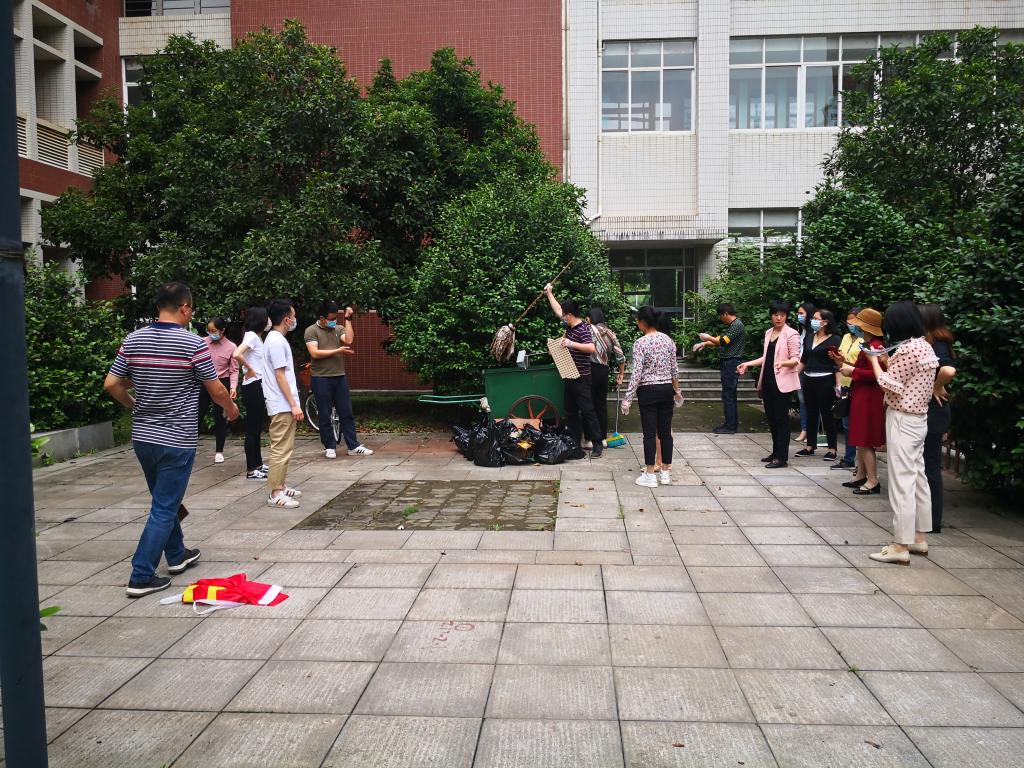 为响应学校《关于在全校开展“爱国卫生大扫除”的通知》精神,5月26日下午,行政党支部开展校园爱国卫生大扫除,支委会认真组织,支部党员积极参与。院党委书记孔伟红与大家一同清理工科二号楼及周围相关公共区域,党员同志们热情很高,大家全副武装,带上手套,手提垃圾袋、扫把、撮箕等工具,钻进树林,将各种果皮、纸屑、烟蒂、塑料袋、玻璃瓶等废弃物捡进垃圾袋,将建筑垃圾收集整理放在工二附近的一个垃圾站里,不一会儿,满满的几大袋垃圾堆放在垃圾车里,所到之处面貌一新。