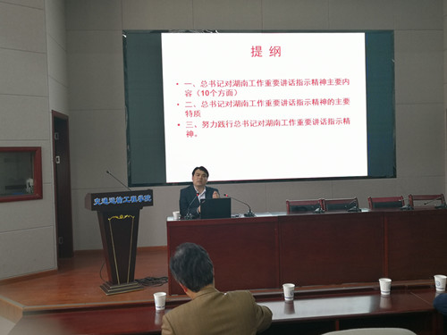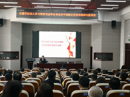为认真落实省委巡视组关于巡视永利官网的反馈意见,深入贯彻落实习近平总书记关于湖南工作的讲话精神,3月19日下午,交通学院举办《深入学习贯彻习近平总书记关于湖南工作讲话精神专题报告会》,报告会由永利官网马克思主义学院党委书记易显飞教授主讲,院党委副书记田上主持,全院教职工参加。