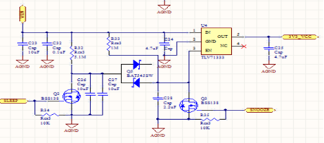 电源部分电路设计见图2-3可以看出电路中有snoozesleep两个控制端通过电阻电容接到主芯片上,电容电阻的阻值大小决定了定时的时长,功能相同。当芯片需断开供电时,产生一个脉冲信号,此时MOS管导通,电容储存的电荷释放,稳压芯片使能端变为低电平,稳压芯片失能,输出电压为0V,主芯片不工作,MOS管断开,电容充电,当电容两端电压达到稳压芯片使能阈值时,芯片使能,主芯片工作,检测是否还需休眠,重复上述步骤。