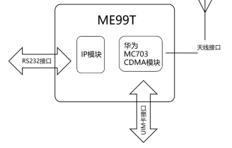 要实现对危险品道路运输的实时监控,项目组把系统分为车载终端和远程监控中心,车载终端采集上述车辆位置,危险品周围环境参数,并通过CDMA模块传输到远程监控中心,远程监控中心将这些数据进行存储和管理。项目组选用了ME99T嵌入式CDMADTU搭建通信链路,它内置了相互独立的IP模块和华为MC703CDMA模块,内部结构图如图3-11所示。