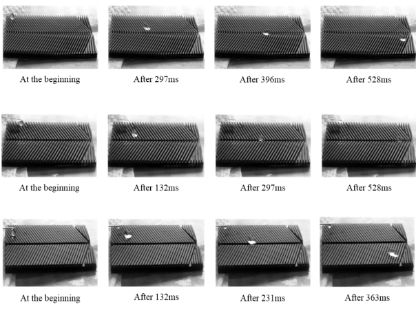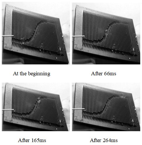 (1)利用有限元软件Solidworks设计了五个不同形状的超疏水结构阵列,采用3D打印制备出样品(如图11所示)。利用接触角仪对其接触角进行检测,并对其进行了弹跳实验(如图12所示)。实验结果发现:液滴在交错长方体阵列上的接触面积大于其他阵列,所产生的表面张力较大,弹跳性能最好。同时,还发现弹跳指数与表面接触时间成反比,阵列结构形状不同,相应的液滴接触面积不同;而接触面积越大,液滴渗入阵列内部更为充分,毛细张力增大,向上的加速度变大,回弹速度加快,液滴与表面接触时间缩短。