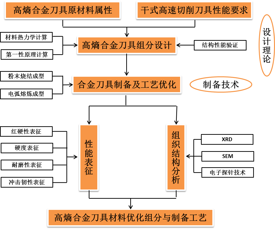 高熵合金刀具材料的制备工艺——采用电弧熔炼法和粉末烧结法制备高熵合金刀具材料,研究制备工艺参数对刀具材料微观组织结构和性能的影响规律;