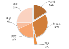 传统的金属切削加工大多采用湿式切削法。在湿式切削法中,切削液主要有三大功能:润滑作用、冷却作用、清洗和排屑作用。这些功能对工件已加工表面质量和刀具耐用度有一定影响,而且大量使用切削液会导致制造成本的增加(美国企业对加工成本的统计见图1,同时切削液对环境造成了严重污染(切削液的化学成分见表1,甚至一定程度危害操作工人的身体健康。基于此情况,干式高速切削技术因其更环保且效率高,从而逐渐显现出优势所在,在未来制造领域具有巨大的潜在应用潜力[1]。干式高速切削技术[23]就是在切削过程中,刀具与工件及刀具与切屑的接触区不使用任何切削液体介质的加工工艺方法,其分为两种类型:一种是不使用任何冷却润滑介质的纯干式切削;另一种是单纯以气体射流(空气、氧气、氮气和氩气等)为冷却润滑介质的干式切削。干式切削技术通常应用于高速切削场合,其最大的特点是不使用切削液简化了工艺系统,降低了加工成本,从源头上控制污染从而解决湿式切削带来的环境与安全健康问题。干式切削技术要在不使用切削液的同时,保证加工的高效率、产品的高质量、刀具的高使用寿命和切削过程的高可靠性,这就需要性能优良的干式切削刀具以及辅助设备代替传统切削中切削液的作用。