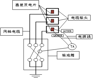 辅助电源为温差发电模块如图2所示。温差发电片装在电缆接头内,用隔热垫片做成盒子,温差发电片的热面位于盒外,用导热硅胶使之贴在电缆绝缘接头内连接管处,冷面处于盒内,引出两线连接传感器及运放电源引脚。