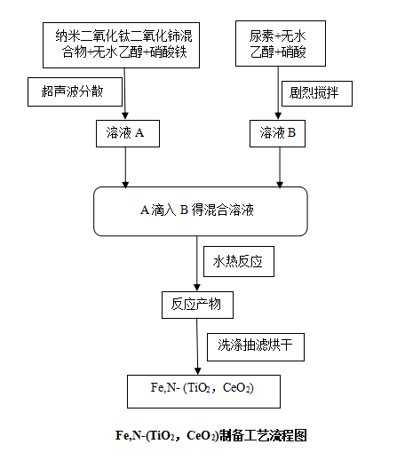 1、将硝酸铁作为Fe源,尿素作为N源,与TiO2CeO2粉体通过水热合成法合成Fe,N-(TiO2,CeO2)纳米粉体,找出最优的设计工艺与合成实验方案。