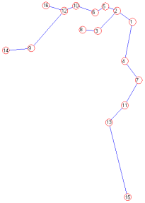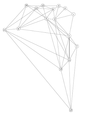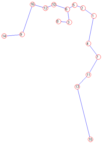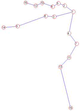 区域供冷供热管网系统布局优化就是在图1中的45条边中选择15条边,构造成一个树状管网布局,如图2: