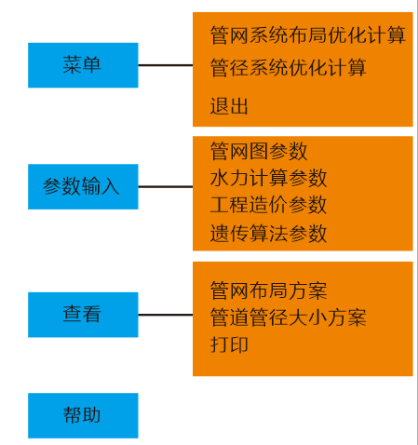 集成后的界面主要功能分为管网布局计算,管径优化计算,参数输入和计算结果查看,用户可以对管网和管径的计算参数进行修改,管网布局计算结果和管径优化的计算结果可以保存,查看和打印。管网连接点数据的输入采用图形化的方式进行选点,以减少输入数据产生的误差和增强软件的交互能力和直观性,界面中的“帮助”按钮用以提示用户输入参数的格式。具体结构如下图9所示: