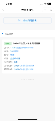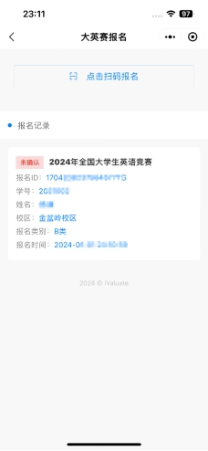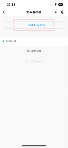 在“iValuate”小程序首页点击“大英赛报名”图标,进入报名界面。