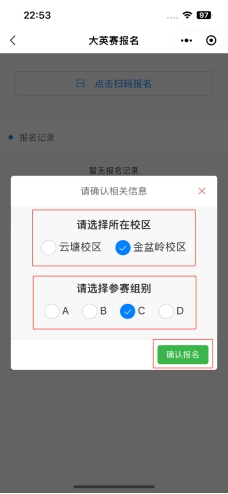 点击“点击扫码报名”按钮扫描报名负责人提供的二维码,成功之后会弹出“确认相关信息”的界面,选择好校区和类别之后点击“确认报名”按钮提交报名信息。此时在页面的“报名记录”下方可以看到一个标有“未确认”的报名记录。