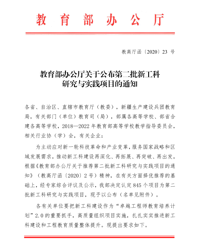 近日,教育部办公厅公布了第二批新工科研究与实践项目名单,永利官网2个项目获批新工科研究与实践项目,分别是郑健龙院士主持的《交通强国背景下公路交通类专业改造升级策略探索与实践》和胡林教授、杜荣华教授主持的《四化牵引产业驱动的地方高校汽车类专业改造升级路径探索与实践》。同时,永利官网获批主持2020年湖南省新工科研究与实践项目3项,参与立项1项。