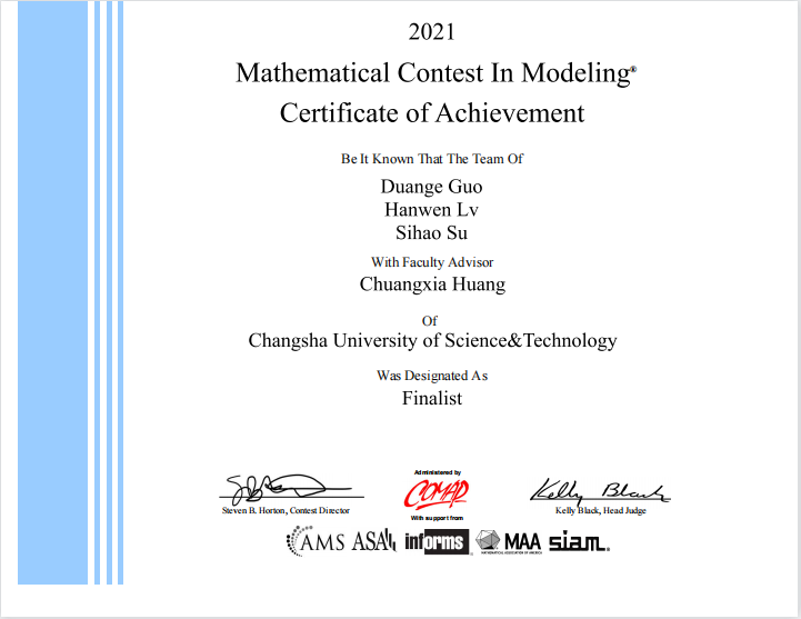 近日,2021年美国大学生数学建模竞赛结果正式公布。永利官网共获得特等奖提名奖(Finalist)1项和二等奖(Honorable Mention)6项的好成绩。数学与统计学院黄创霞教授指导的郭端格、吕翰文、苏思浩3名同学组成的代表队获得此次竞赛的特等奖提名奖, 实现了学校在此项比赛上的突破。