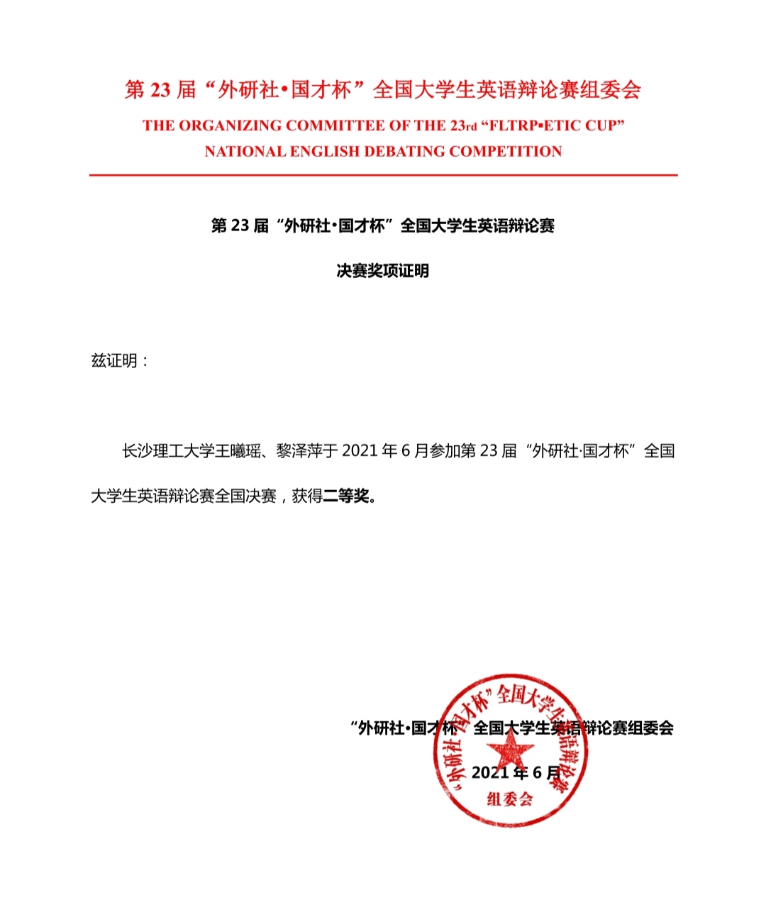 近日,第23届“外研社·国才杯”全国大学生英语辩论赛圆满结束。永利官网2018级英语专业本科生王曦瑶、2019级翻译专业本科生黎泽萍,在外国语学院王浩萍老师的悉心指导下,以过硬的专业素养、扎实的思辨能力,荣获该项赛事全国二等奖。