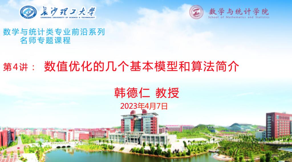 4月7日上午,数统学院继续开展“数学与统计类专业前沿系列名师专题课程”第四讲,特邀嘉宾是北京航空航天大学数学科学学院院长、国家杰出青年科学基金项目获得者、教育部数学类专业教指委秘书长韩德仁教授,讲座主题为“数值优化的几个基本模型和算法简介”。讲座由数统学院院长张宏伟教授主持,数统学院师生共200余人参加。