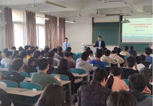 授课内容包括三部分:一是膨胀土的基本性质;二是土工合成材料的种类与功能;三是几种土工合成材料用于稳定公路膨胀土边坡技术的理论与工程应用。邹维列教授首先以膨胀土分布特点及其危害为切入点,介绍了膨胀土边坡治理的主要历史过程,突出了膨胀土“吸水膨胀、失水收缩”特点给实际工程带来的巨大挑战;接着,以稳定膨胀土边坡需解决的几个关键问题入手,引入了土工合成材料,并详细阐述了土工合成材料的特点及应用形式;最后,以具体工程实例向同学们展示了土工泡沫、袋装土、格栅加筋土和玻璃钢螺旋锚等典型土工合成材料在膨胀土边坡治理中的应用。