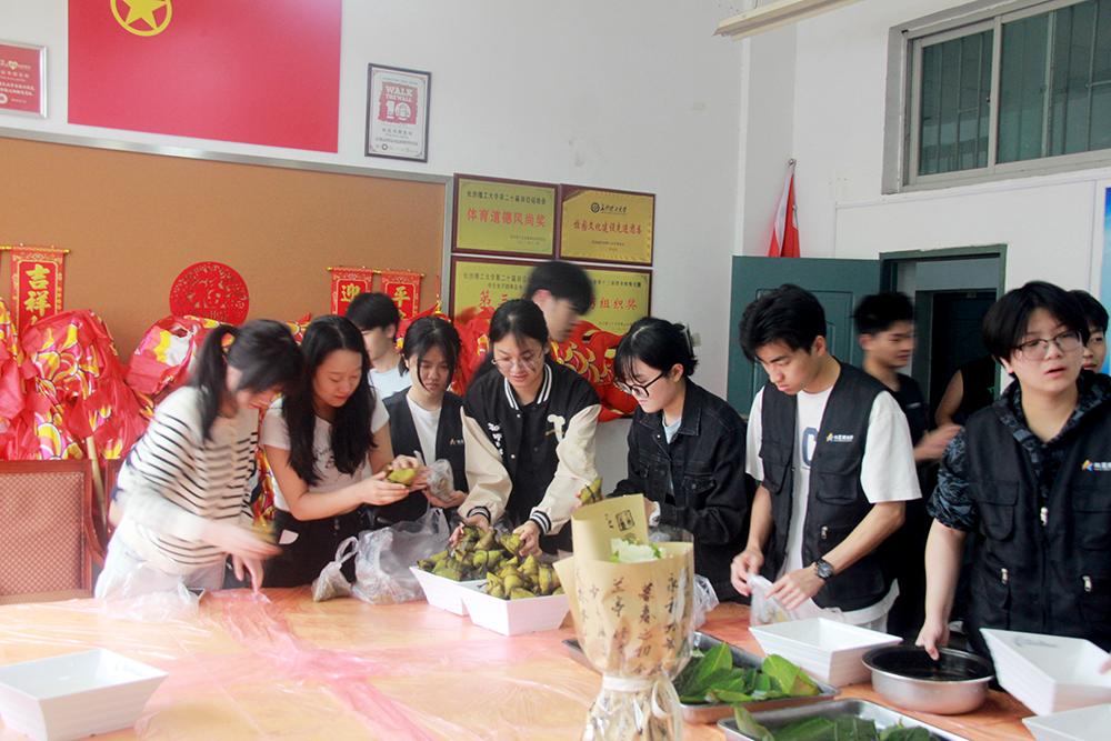 在14号教学楼分团委学生会办公室,虹星团支部成员在学工部韩老师的详细讲解和手把手的教学指导下,分组进行了操作实践,积极学习如何包粽子,卷粽叶、放糯米、放馅料、捆扎绳子等,体验着制作美食的快乐,切身感受到了端午节浓浓的节日氛围。