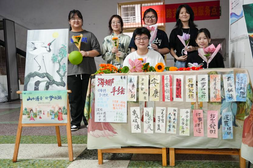 开展时正逢学生上课阶段,风格各异的展台和展架吸引了大量同学和老师的眼球,也使得一些同学驻足参观和问询。课间,下课的同学们大量涌入展示区域,对每个集市摊位都倍感好奇,到每个展台前参观展示作品,参与互动游戏,学院的老师们也参与进来,和同学们一起打卡体验、拍照,这一整天,整个展示区域都人来人往,热闹非凡。