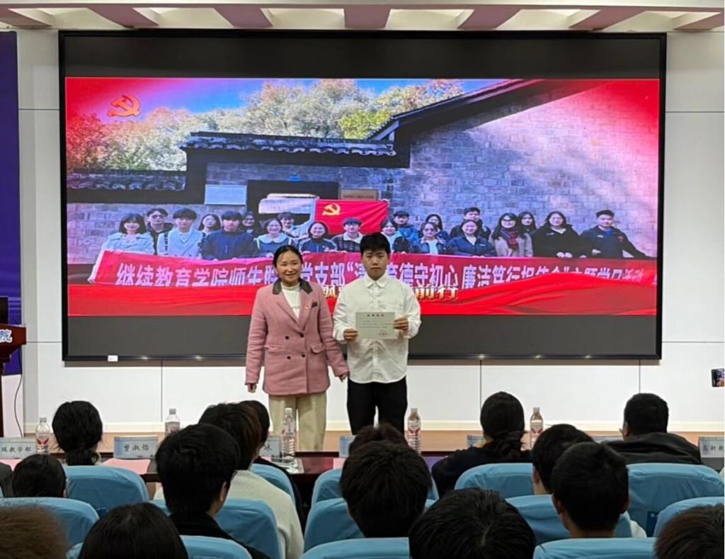 4月16日晚7:00,继续教育学院分党校在12教200会议室举行2025年下半年结业典礼暨2026年上半年开班仪式。院党委副书记、副院长任艮丰,师生党支部书记谭冰,宣传委员曾淑怡,各教学部学工负责人以及全体学员参加了会议。