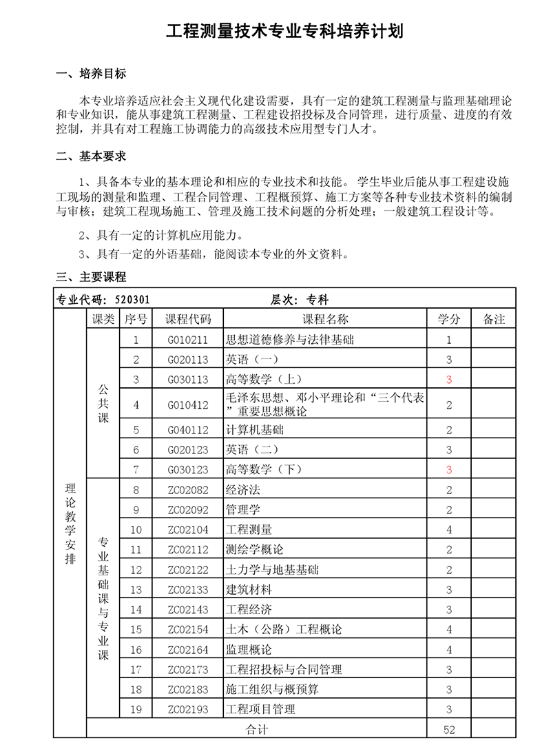 专科培养计划-专业代码:520301 工程测量技术专业