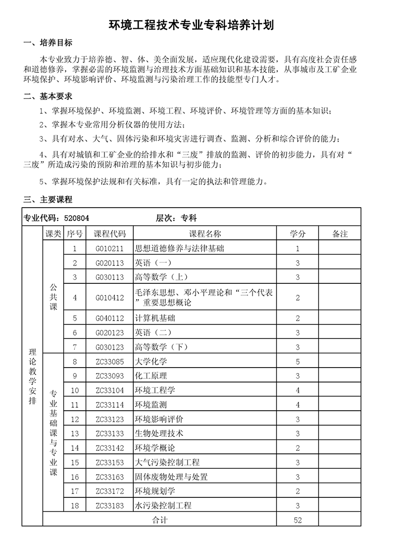 专科培养计划-专业代码:520804 环境工程技术专业