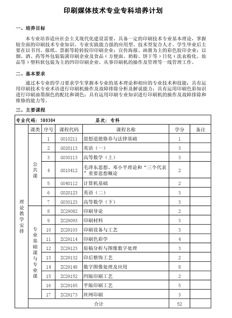 专科培养计划-专业代码:580304 印刷媒体技术专业