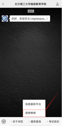 1.关注微信公众号“永利集团88304官网继续教育学院”,点击“服务查询-报修维修”,如下图所示。